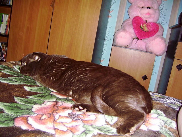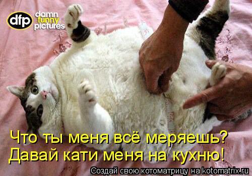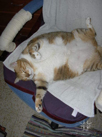 Его прошлой зимой, за месяц моего отсутствия, родители раскормили. Тройную дозу, против обычной, на день кошакам давали ("а вдруг не наедятся?"). Запретила и близко подходить к их еде, кормлю только сама и строго 2 раза в день. Схуднул... слегка :), примерно до своих прежних габаритов.