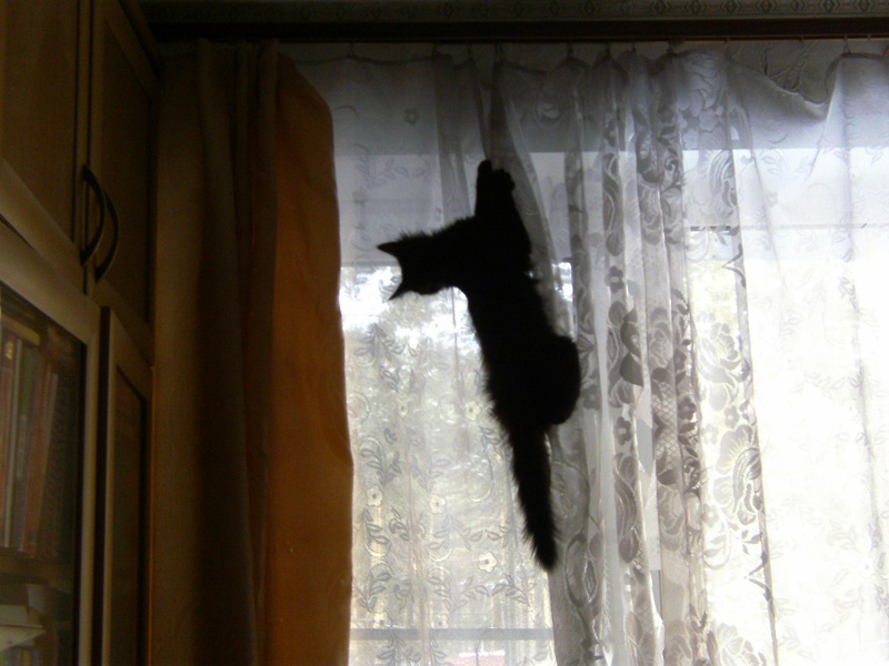 Вообще, у котят есть такое свойство: очень быстро вырастают... Еще чуть-чуть -- и Кузька уже по шторам не сможет скакать, всяко, сам.