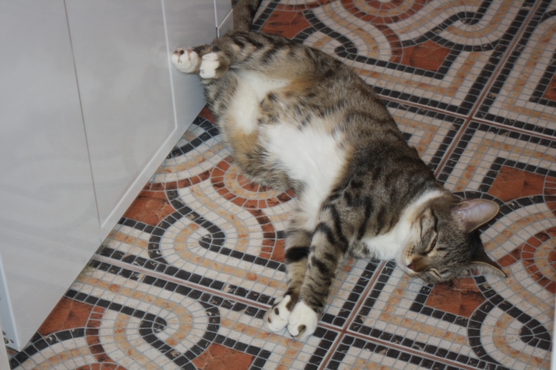 Мара черный пятнистый табби опять же (тут даже без вопросов о пятне) с белым. А вот какой он белый... Его вроде и меньше, чем одна треть, до биколора вроде и не дотягивает с одной стороны, но вот распределение от шеи до паха ну уж очень характерное для биколоров.У нее жирный воротник-слюнявчик, такой широкий и трусики-бикини такие мощные.