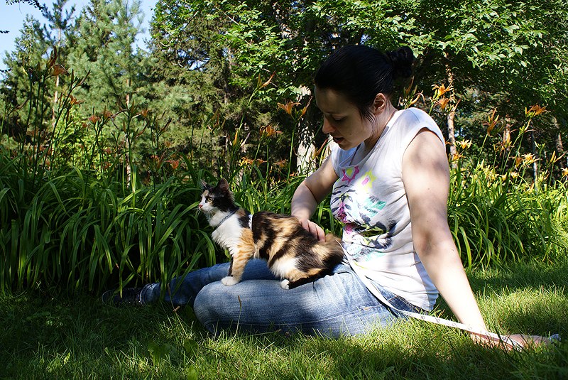 Какая яркая она кошка! как себя на улице чувствует?прекрасно. сначала пугалась громких звуков, грохота, а обратно на моём плече ехала всю дорогу, по сторонам глазела) опасается собак и детей, а так нормально. в переноске вообще замечательно, молчит и созерцает)