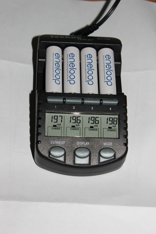 Новые SANYO Eneloop HR-3UTGA вставляем на зарядку и фотаем.Чтобы не было недопонимания - на фотке ток заряда, а не ёмкость аккумуляторов. La Cross ёмкость показывает только после полного заряда.