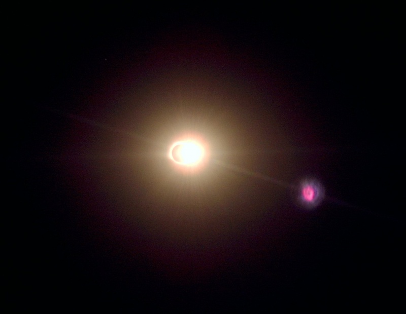 А кто знает, что это за красный маленький язычок на 2 часа? Думал, у меня косяк с фотиком. Однако поглядел тут фото других - тоже его видно!Протуберанец? Тогда вам повезло!