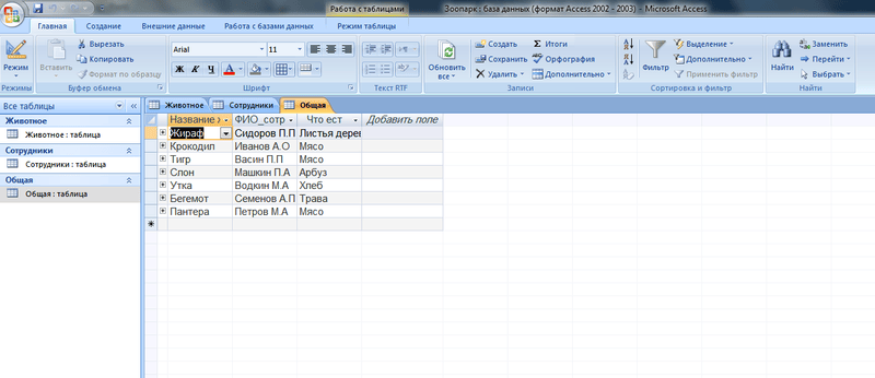Давай говори какие таблицы есть какие поля (можно скринами) будем помагатьСоздать базу данных зоопарка, включающую сведения о штате, животных и кормах. Определить кто, кого и чем кормит.
