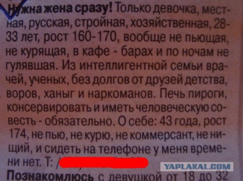 Я таких видела. Щас пойду поищу кандидатуры.А когда Принцессе хотелось замуж, она устраивала репетицию: папильотки, тапки, фартук - и шла на королевскую кухню варить борщ. Через час желание как рукой снимало, и Принцесса возвращалась мечтать.