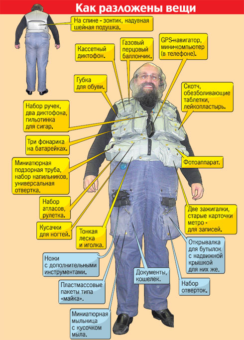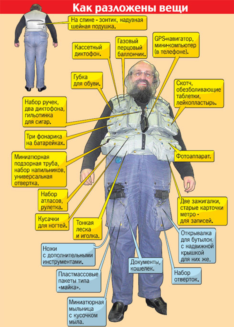 экспресс-анализ личных и "сумчатых" карманов за неделю: кредитная карта, дебетовая карта, мелкие деньги, плоские ключи от чего-нибудь, дисконтные карточки ежедневные, т.е. "общепитовские", любое удостоверение личности, презервативы, какая-нибудь таблетка от какой-нибудь экстренной боли, место для мобильного, место для того куда и чем записать важную инфу, косметические "экстренные" пробники, зажигалка, сигареты, мини-парфюм, пара фишек, флэ (е?)шка, пропуск куда-нибудь, визитки для важных внезапных встреч, маленькое зеркальце, маленькая расческа, тампоны (прокладки), карты памяти от чего-нибудь, чьи-нибудь важные визитки и т.п.