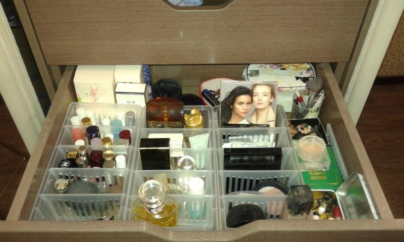 Под мелачевку у меня пластиковый комод. Смотрится не дешево и очень вписывается в стиль, т.к рисунок схож с дизайном обоев. В нижнем ящике все документы, карточки, договоры, чеки с гарантией и т.д. (их разложила по папкам в файлики, чтобы быстро можно было найти то, что нужно. Во втором ящике косметичка и всякие крема-гели-маски, т.е то, чем пользуюсь не каждый день, но пользуюсь. В третьем ящике коробка с медикаментами, т.е все таблетки, снадобья и все-все-все от болезни. А в четвертом ящике всякие штуки, которые нужны, но которым нет места. (батарейки, зарядки, лампочки)