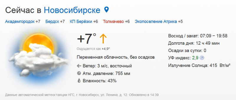Ну в итоге получилось среднее арифметическое, думаю, можно доверять Данные автоматической метеостанции НГС, г. Новосибирск, ул. Ленина, д. 12. Обновлено в 14:39