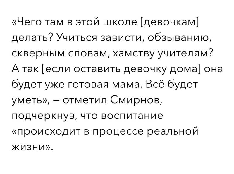 Любой может послушать эту передачу и убедиться, что батюшка рассказал конкретную историю о знакомой ему девочке из его прихода, которая, по всей видимости, находится на домашнем обучении и в 7 лет уже умеет читать и писать, помогает матери сидеть с младенцем. Да, с какими-то акцентами и в этом выступлении можно спорить, но из него никак, ну никак не следует, что “протоиерей Смирнов призвал не отдавать девочек в школу».”