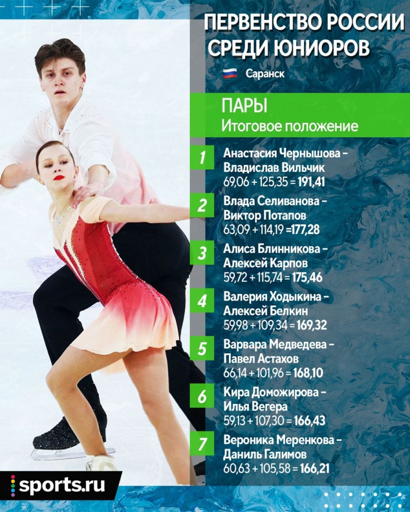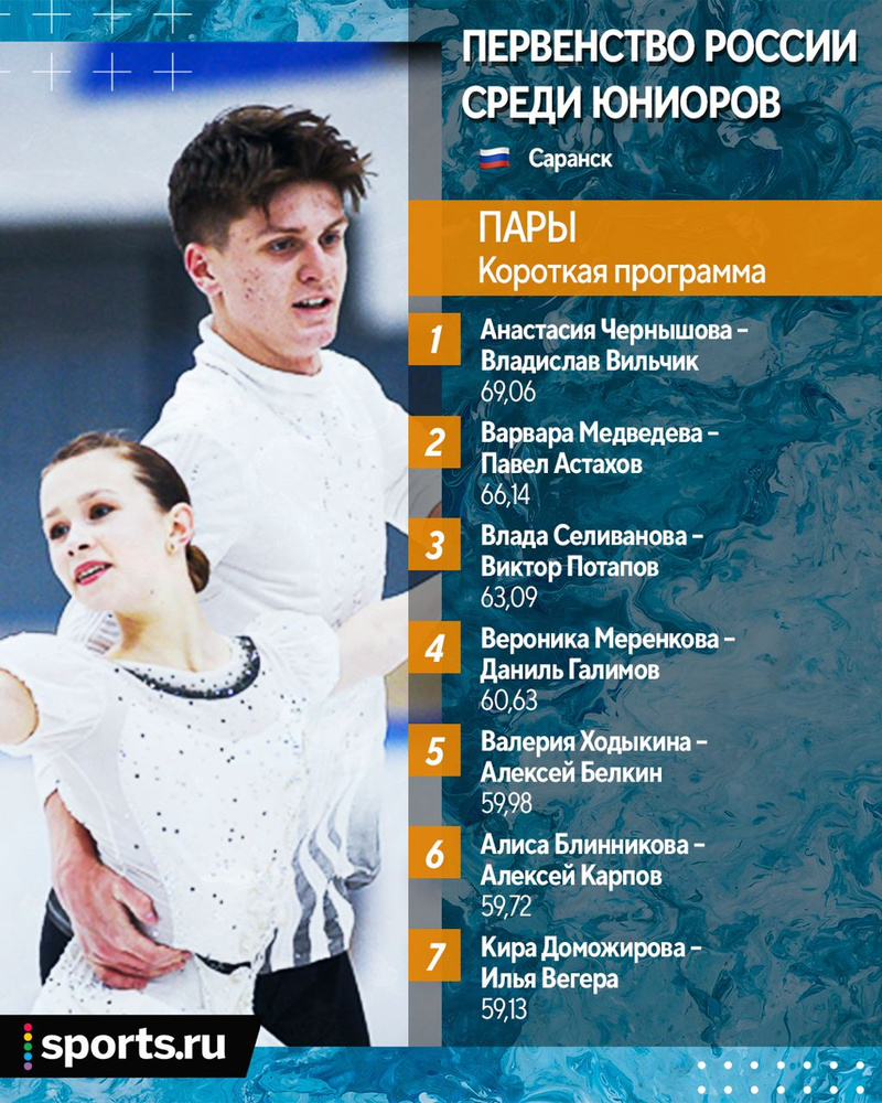 Анастасия Чернышова и Владислав Вильчик выиграли с оценкой в 69.06 балла. На втором месте с результатом 66.14 балла идут Варвара Медведева и Павел Астахов. Третье промежуточное место занимают -Влада Селиванова и Виктор Потапов — 63.09.