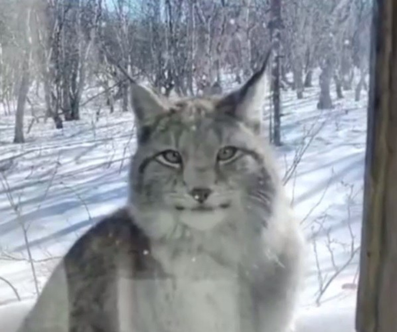 Любопытная рысь пришла в гости к людям и внимательно наблюдала в окно дома инспектора камчатского заповедника