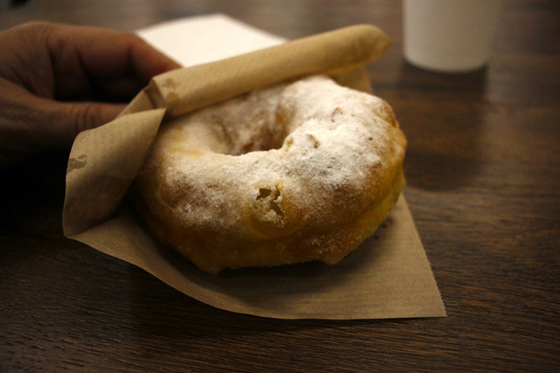 Пробовал только классику, с сахарной пудрой (45 рублей штука), но там есть и с начинками (по 90). И они прямо прекрасные. С хрустящей, местами даже с лопнувшими пузырями, корочкой и нежным содержимым. Которое сочетает органолептическую легкость и достаточно насыщенный вкус. Делают их тут колечками, но довольно толстыми, дырка существенно меньше, чем у американских «донатов».