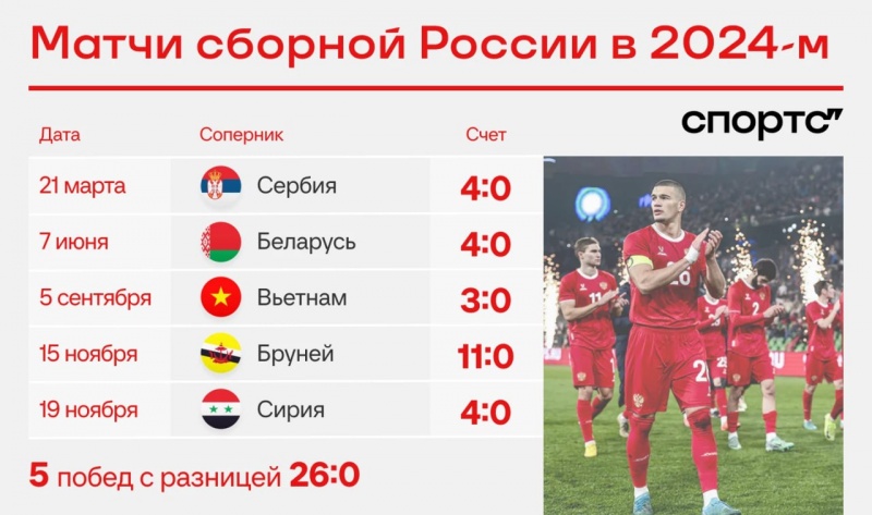 • В этом году сборная России по футболу одержала победы во всех матчах, не пропустив ни одного гола. Она играла с Сербией, Беларусью, Вьетнамом, Брунеем и Сирией