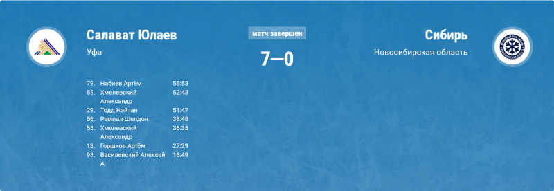 Матч завершён. Со счётом 7:0 победил Салават Юлаев