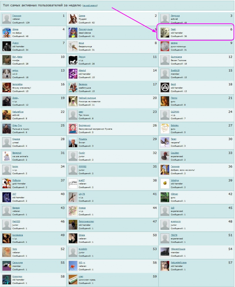 За неделю 59 человек не поленились что-нибудь написать на форуме. Не то чтоб цифра была особо красивой, но меньше 70 еще не виделА чо меня нету в списке