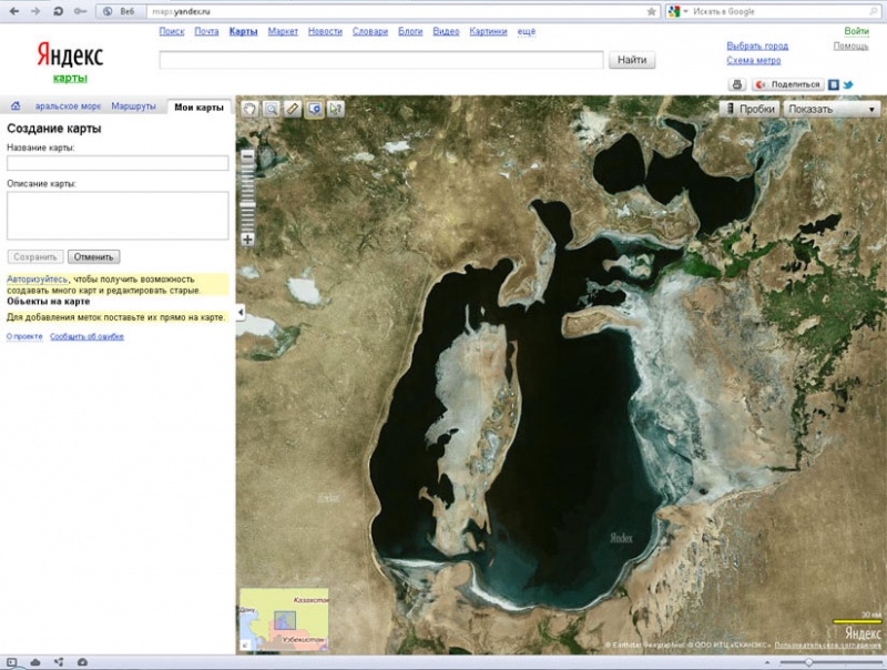 В прошлом году, в частности. Правда, при выборе между Аралом и Таиландом выиграл второй вариант, но в этом году может оказаться возможность побывать более чем в 1 месте. Да, а мотивировали тем: типа приезжай скорее, а то скоро, глядишь, Арал вообще исчезнет. Речь идет о пересыхающем озере к юго-западу от большой дамбы. Решил интереса для посмотреть карты, и слегка офигел: то ли море понемногу восстанавливается, то ли спутники врут. Скрин 1 - это яндекс - удивительно оптимистично. Скрин 2 - гугл. Поскромнее, но тем не менее... Особенно, если учесть, что в 2009 году Арал выглядел как на скрине 3 - таки прогресс! Отправил в Казахстан, они там сами офигели, всё говорят - летом едем на Барсакельмес, это уже опять полуостров. Но пока что-то никто не подтверждает, что там так все здорово и море возвращается. А было бы интересно...
