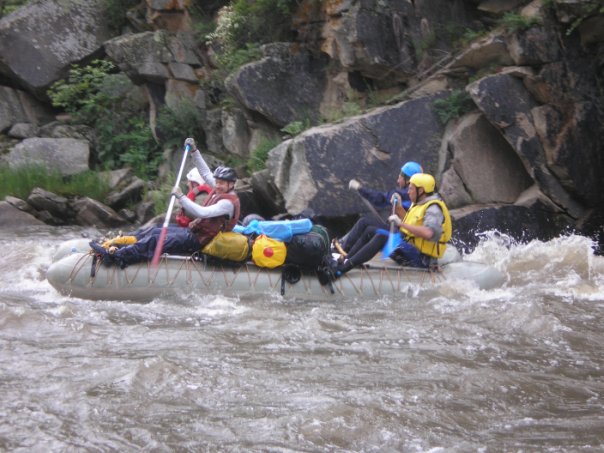 Пяти метровый рафт и 3-и двойки. Шли по всем порогам по полной программе, чтоб мало не показалось))). Перевернуться не удалось нигде, как мы не старались))) Недостаток адреналина восполняли как могли))).