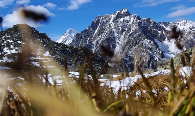 Идти по снежку было приятно – не сыпется под ногами, разве что иногда проваливаешься по колени. Кошки сначала не одели, вроде как и необходимости не было. Подстегивала только одна мысль – надо вылезти на гребень пока Солнце основательно не пригрело камни, а то сверху начнут сходить «паровозики».
