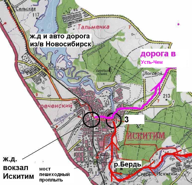 с. Усть- Чем- с. Девкино- с. Харино- с. Горлово- с. Старый Искитим- г. Искитим- (сплав р. Бердь).