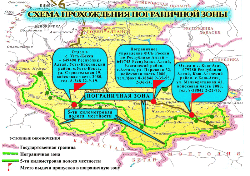 Приказ Федеральной службы безопасности Российской Федерации от 15 октября 2012 г. N 515 г. Москва "Об утверждении Правил пограничного режима" в соответствии с которым С 1 января 2013 года для граждан России оформление пропусков в погранзону не требуется (за исключением нахождения в 5-километровой зоне). Т.е. для нахождения в Усть-Коксинском и Кош-Агачском районах достаточно при себе иметь только паспорт (свидетельство о рождении для несовершеннолетних).