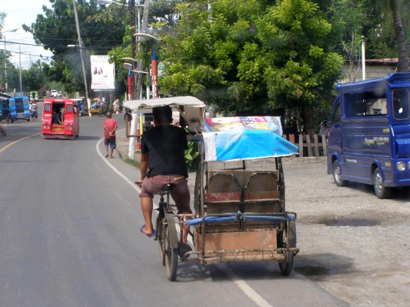В первый день мы решили смотаться самостоятельно в город это буквально в 30 минутах езды от отеля. Транспорт в небольших городах в основном jeepney – это те самые открытые полу-военные автобусы без окон и дверей, часто раскрашенные в самые невообразимые цвета с номерами и даже именами , в основном женскими, трициклы –трехколесные мотоциклы с кабинкой или велосипеды, мопеды и такси. Личных , тем более дорогих машин в маленьких городах практически нет.