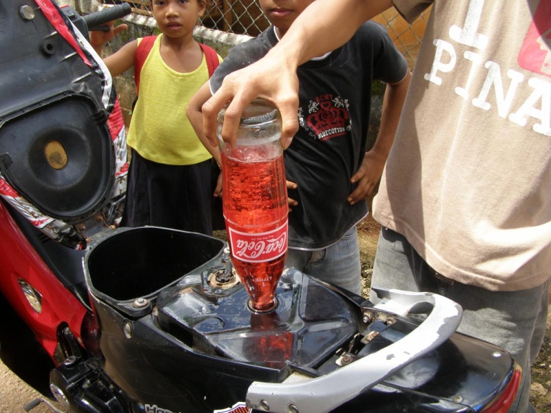 До отеля где жили - 5 км, полуденная жара….спросили у бежавшего мальчугана, где можно заправиться, он показал на ближайший дом….вышла девушка вынесла литровую бутылку из-под кока-колы с красной жидкостью….мы еще с недоверием понюхали жидкость… и правда газолин….Заправились и поехали…..И таких киосков и красных бутылок - на каждом шагу . Прокат мотоцикла кстати 180 рублей в сутки на наши деньги, все это можно перерасчитывать на пол-суток 90 р и по часам