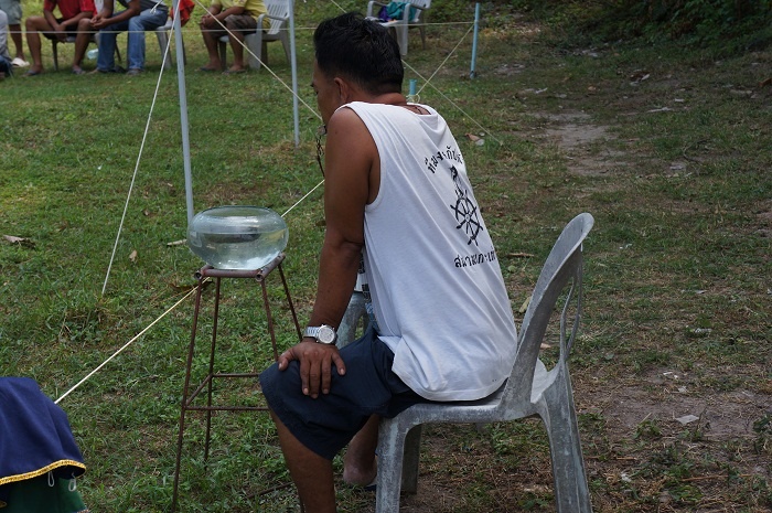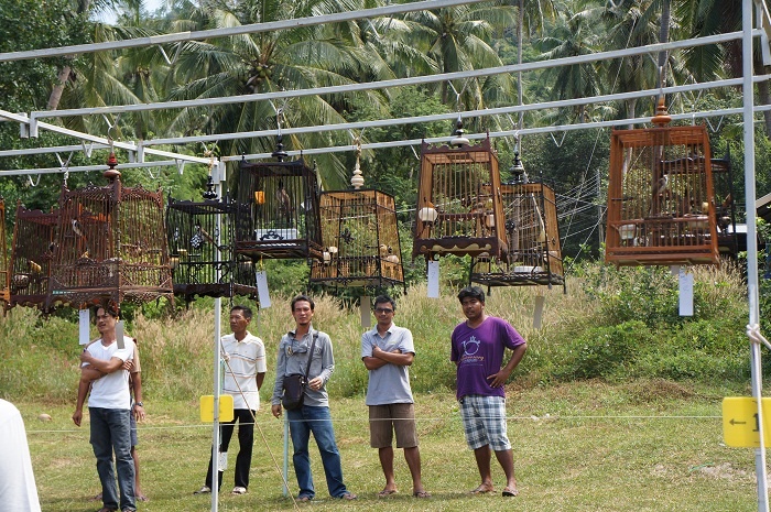На большой площадке висели клетки с певчими птицами, у каждой клетки снизу прикреплена бумажка на которую помощник судьи записывал результат. Как он там что считал, ума не приложу, потому что птички пели наперебой очень громко. Судья сидел с небольшой чашкой воды и туда опускал железную миску с дырками,когда миска тонула и касалась дна звучал свисток и подсчитывались результаты. Тайцы поначалу болели спокойно,потом обстановка начала накаляться и некоторые уже махали руками и что то кричали своим птичкам