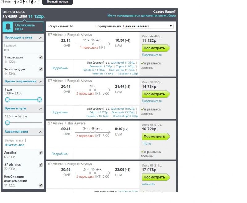 Самые дешевые билеты которые я когда видел!Кстати, цена билетов выше, чем была три года назад, тогда были билеты по 6000 до Бангкока плюс около 500 рублей накидывали за сегмент Bangkok Airways в любой аэропорт, хоть на север в Чианг Май, хоть на острова.