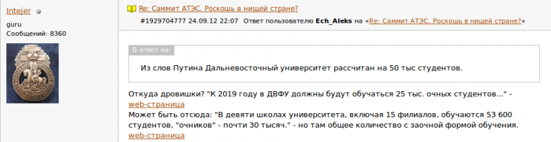 Немало писали также и о Дальневосточном федеральном университете, который зачем-то понадобилось размещать на острове Русский. Наверное, чтобы оправдать строительство моста «в никуда». Так вот, его первоначальная сметная стоимость была 41,7 миллиарда рублей, а вылилась впоследствии в 70 миллиардов. Гигантский вуз имеет площадь в 1 миллион квадратных метров во всех зданиях и помещениях и способен принимать в 5 раз больше студентов, чем имеется в крае....