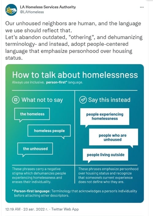 Термин "бомж" отныне объявлен неполиткорректным. Его следует заменить на "человек, проживающий в альтернативном жилье" "человек, испытывающий бездомность", "человек, проживающий снаружи" и тому подобное.
