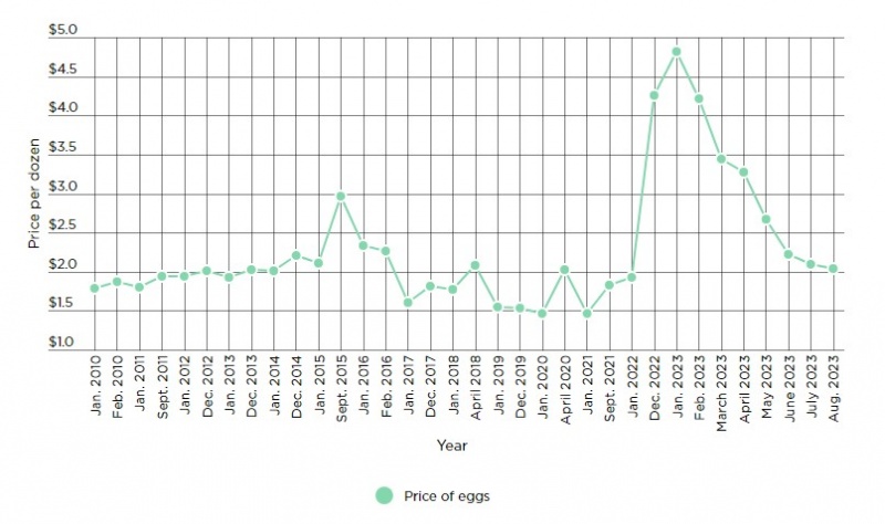 Последние данные ИПЦ показывают, что в период с октября 2022 года по октябрь 2023 года цена на яйца упала на 22,2%, хотя с сентября цена дюжины яиц выросла на несколько центов.