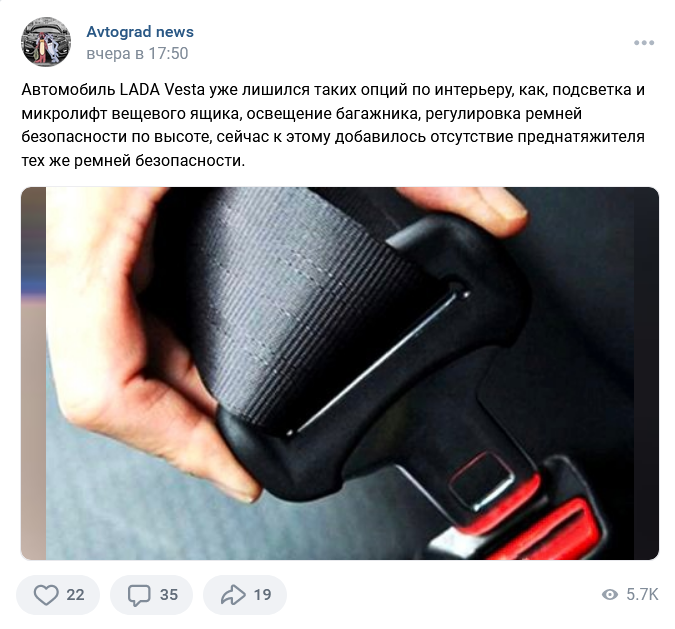 АвтоВАЗ нашел нового поставщика ремней безопасности для автомобилей LADA Granta. Им стала компания из КНР. С 8 декабря они уже устанавливаются на товарные машины», — сообщили в Avtograd News