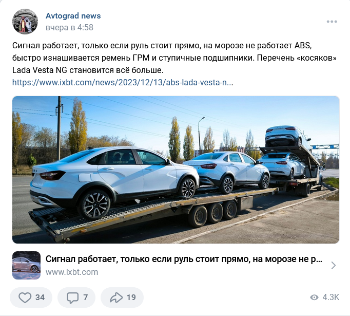 • Сигнал работает, только если руль стоит прямо, на морозе не работает ABS, быстро изнашивается ремень ГРМ и ступичные подшипники. Перечень «косяков» Lada Vesta NG становится всё больше