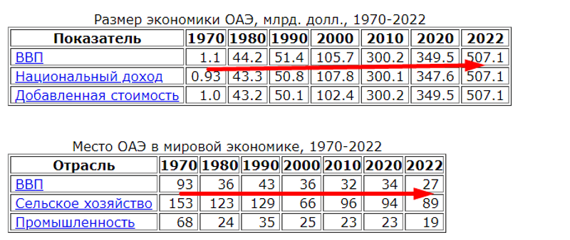 Может читать их попробуешь осилить? А что мы там видим? Да рост ВВП в 44 раза, за за 10 всего 1970-1980, я бы сказал за 7 лет, когда резко выросли цены на нефть и поперло в ОАЭ - вот оно экономическое чудо, потом снижение цен на нефть и скромны рост за 10 лет на примерно 16%, потом рост цен на нефть и рост 2 потом в 3 раза и еще немного, когда чужие деньги пришли и скупили все.