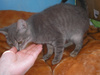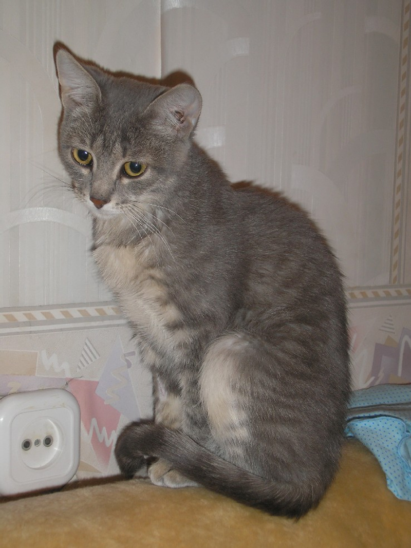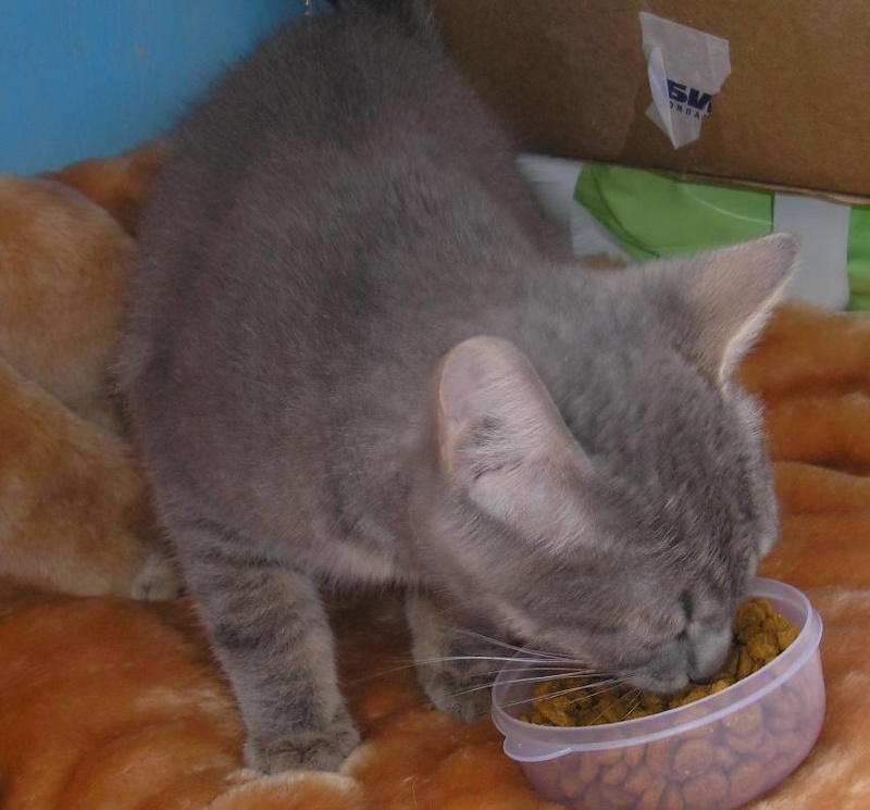 Сегодня утром к нам в квартиру забежал дымчатый котенок. Подросток, месяцев 5 примерно. Худой, голодный. Сейчас обитает на лоджии, помыт от блох (их не обнаружилось, что удивительно). Был ооочень грязный, показан ветеринару, просвечен под лампой, лишая нет. Есть ушной клещик, сегодня почистили ушки, закапали капли. Завтра будет проглистогонен, просто он уже поел, а надо на голодный желудок.