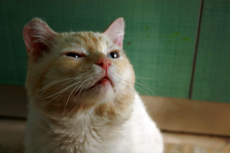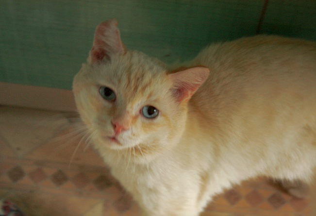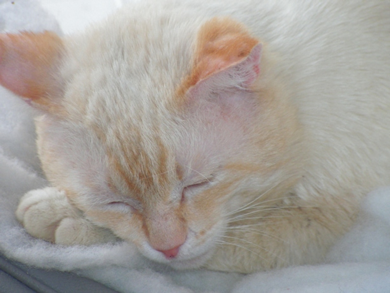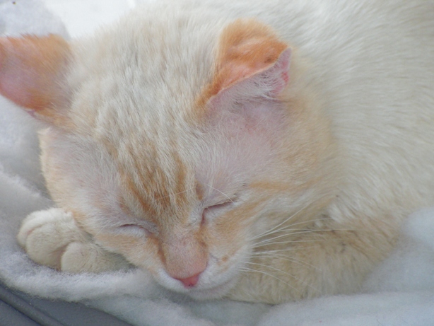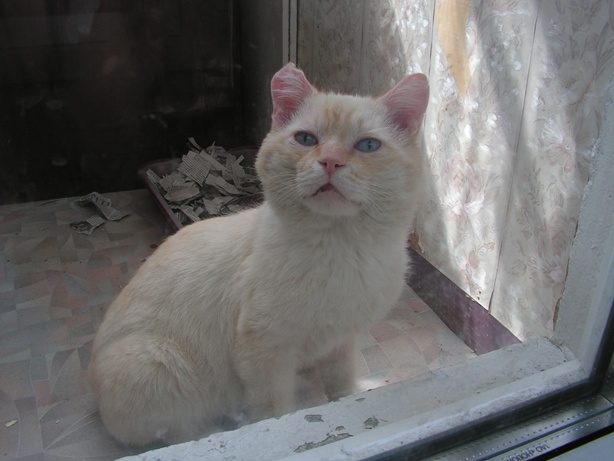 Кот еще приходит в форму, после былых сражений. Одно ухо видимо прищемили дверью - форму не восстановить. Боевые раны заживают (была разодрана морда, подушечки лапок немного подморожены).