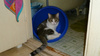 С нашим котостадом из четырех хвостов ведет себя прилично - донимает старших собратьев бесконечным озорством и играми - в процессе игр ни один цветок не пострадал...