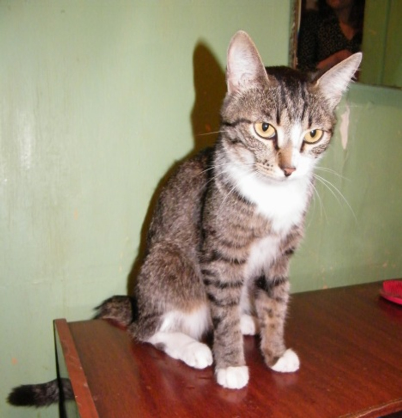 Серый полосатик с белой грудкой и в белых носочках.