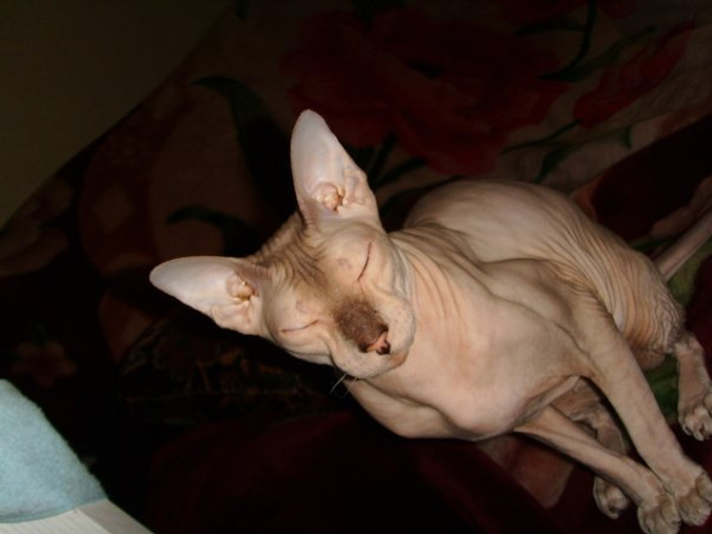 Кошечка умная и ласковая, кто имел петерболдов наверное знают про их нрав. Ходит в лоток.