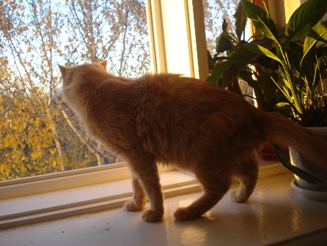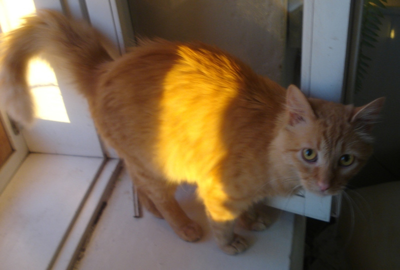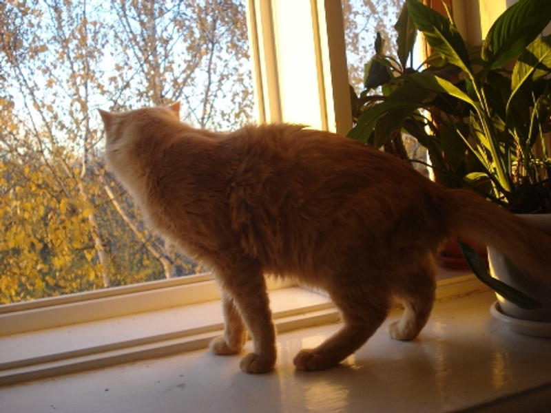 Кот цвета опавшей листвы получил временное имя Кыш, так как реагировал на это слово совсем не так, как мы рассчитывали. Кыш прошел все необходимое обследование у ветеринара, здоров, кастрирован, в отношении горшка безупречен.
