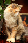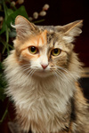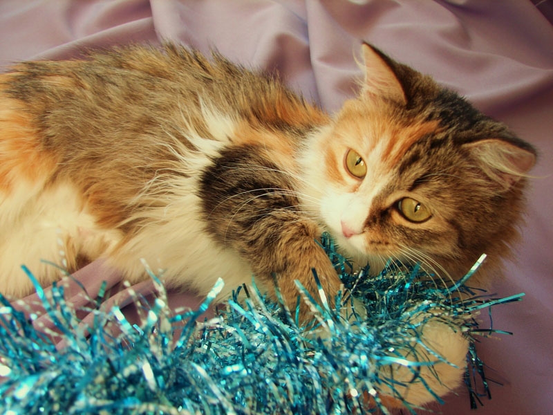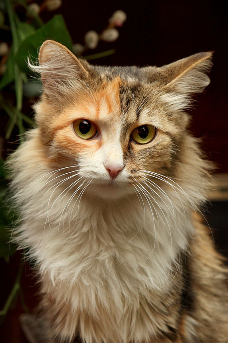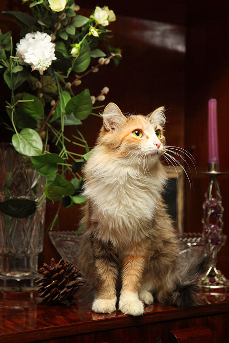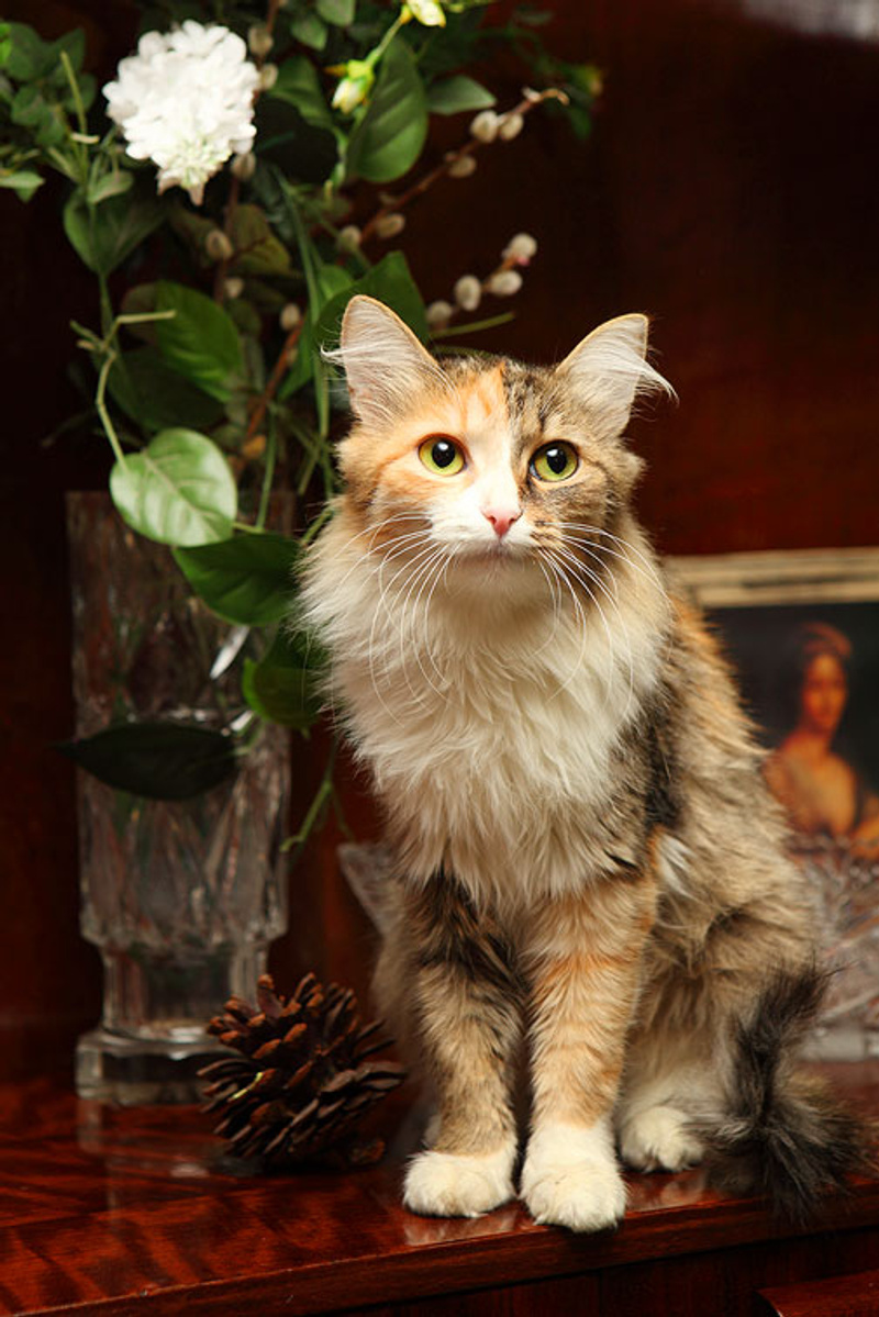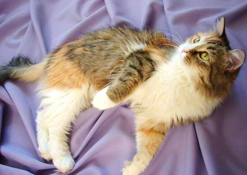 По окрасу кошка очень красивая. Трехцветная, будто широкой кистью прошлись по ее спинке серой и оранжевой краской. Пушистенькая, славная с добрым характером. Очень ласковая, ориентирована на человека. Расскажет вам все новости, которые случились в ваше отсутствие, помурлыкает на руках в знак благодарности.