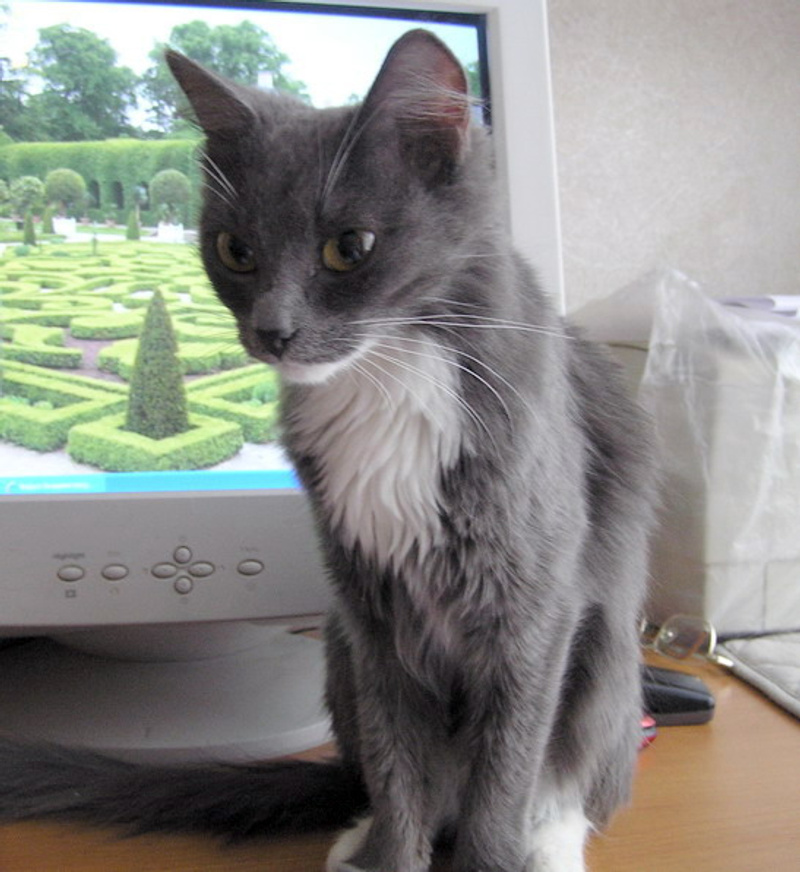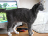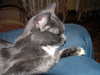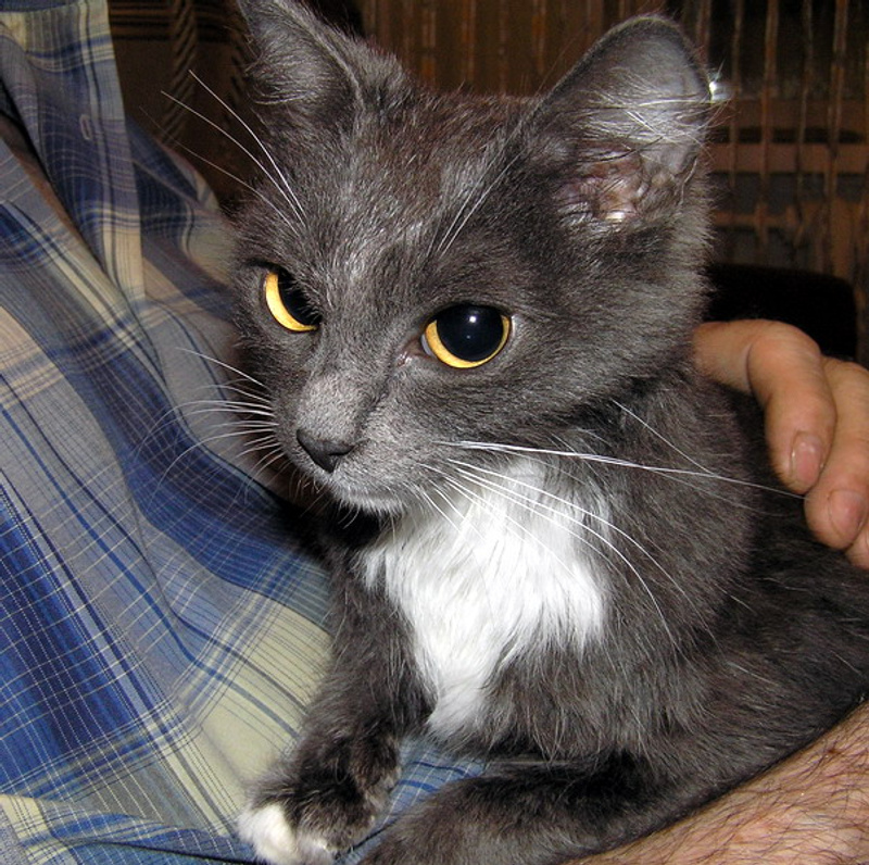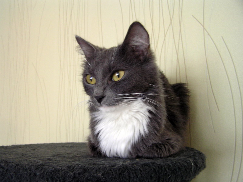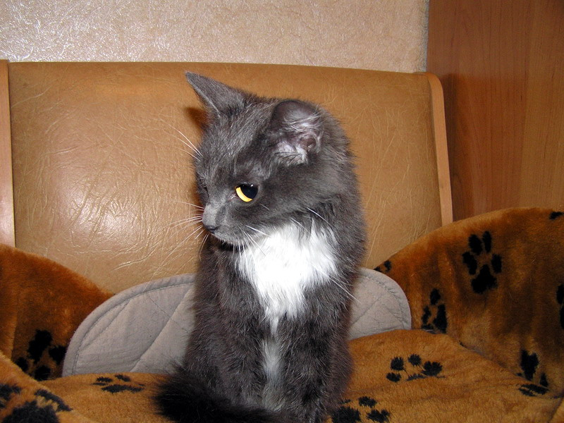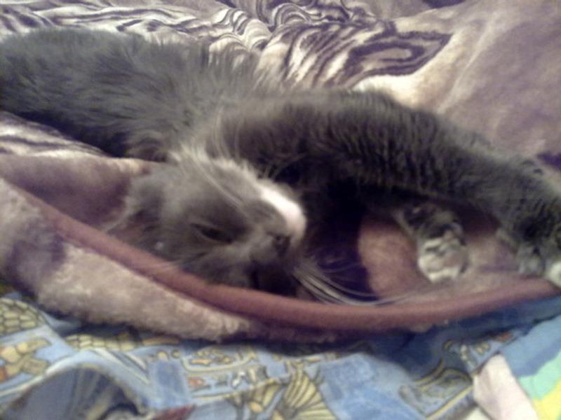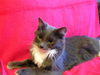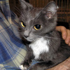 Дымчатая с белой грудкой создание 5-6 месяцев оказалось кошечкой. Шерстка грязная, но ушки чистые, блох нет. Глистогонное получила.