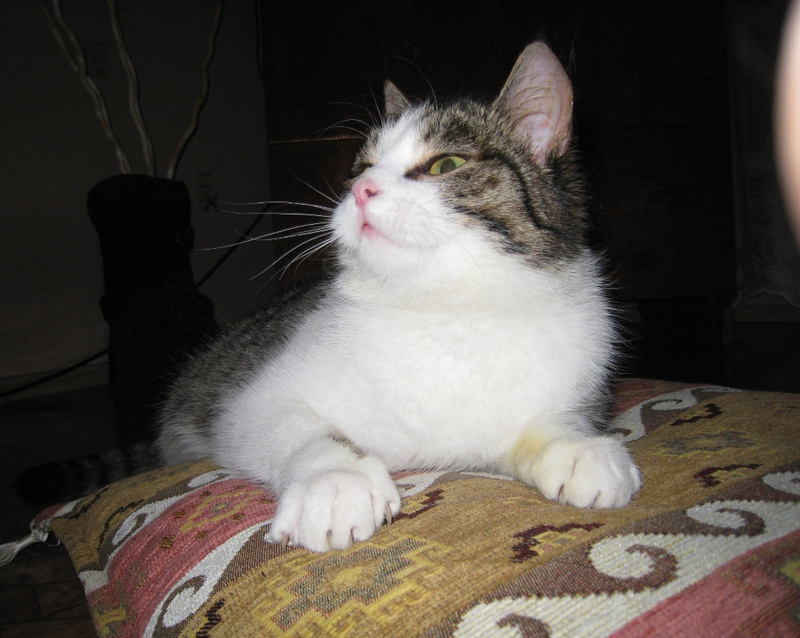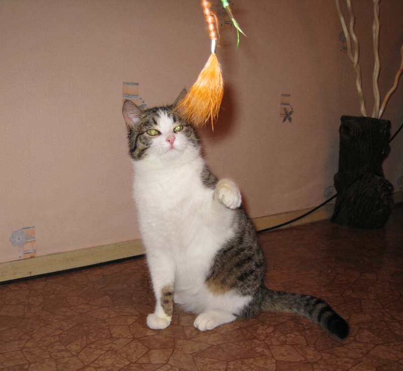 Котейка очень добрый, общительный. Сильно тянется к человеку, ходит по пятам, радостно откликается на ласку и просит её. Урчит и мурлыкает.