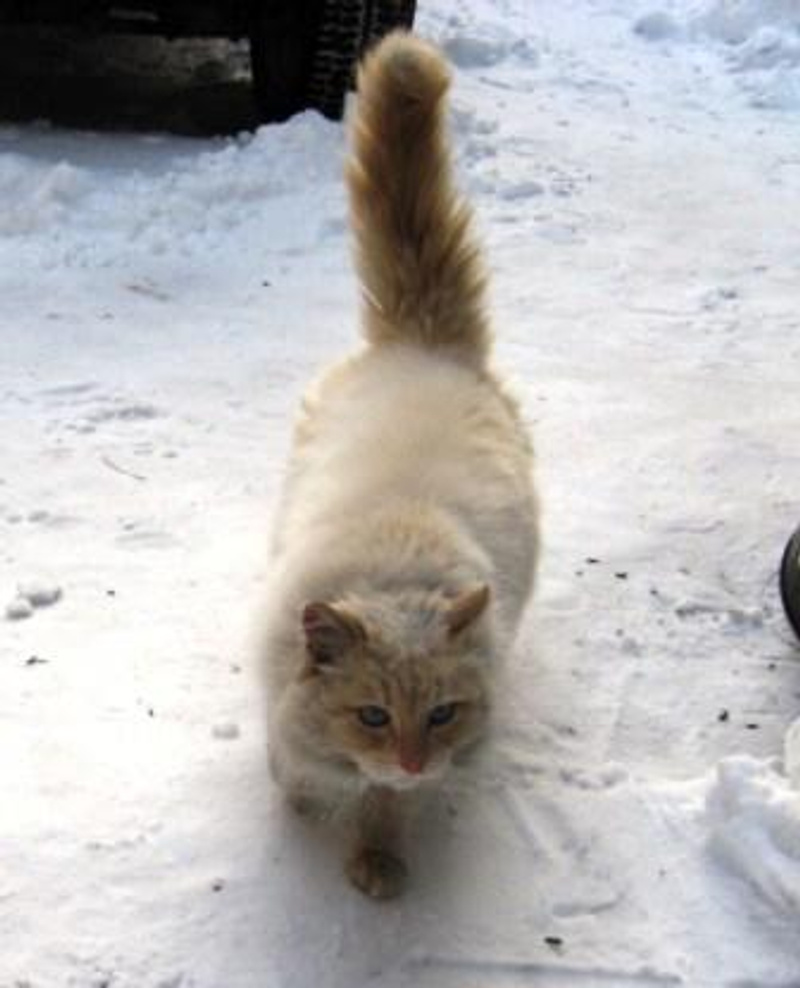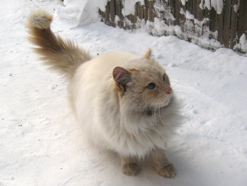 Когда наступили первые крепкие морозы, около нашего дома появилась симпатичная кошечка. Очень пушистая, белая, а лапки, мордочка и хвост рыжие. Сначала мы думали, что чья-то домашняя ходит гулять, но потом увидели, как она грызёт выброшенную кем-то мёрзлую гречку... Стало ясно, что дома у неё нет