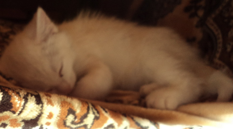 Котенку 8 января будет два месяца, мама пушистая полуперс. Котенок не очень пушистый, но полностью белый. Пол женский. Очень игривая. Ест все продряд: от рыбы до сыра и сметаны. Вес сейчас около 800 грамм. Молоко мамы уже не ест. Один недостаток - она глухая. В остальном все нормально, очень веселая кошечка.