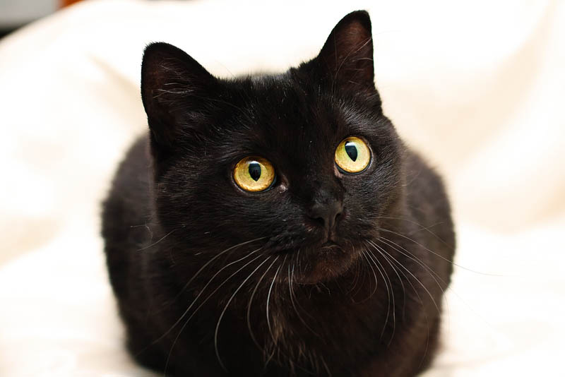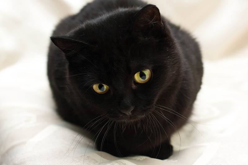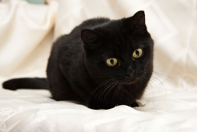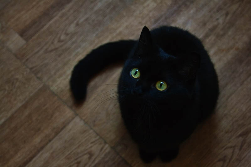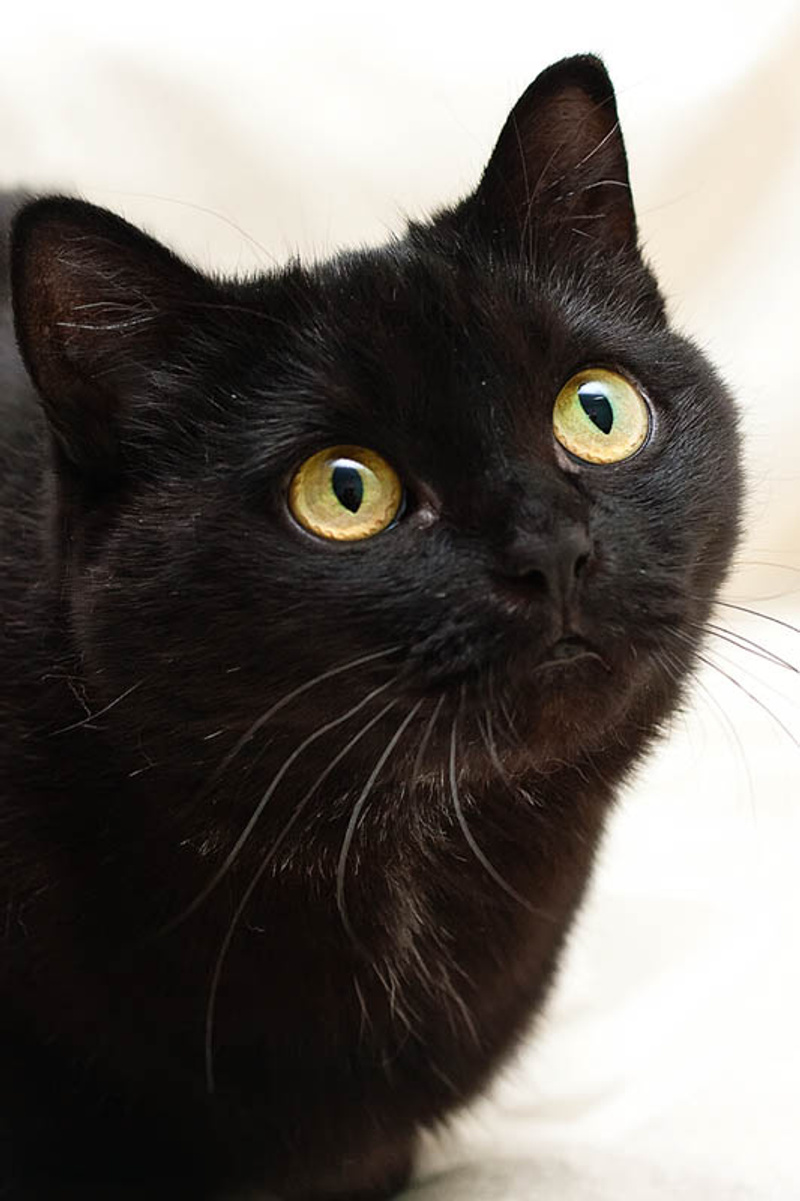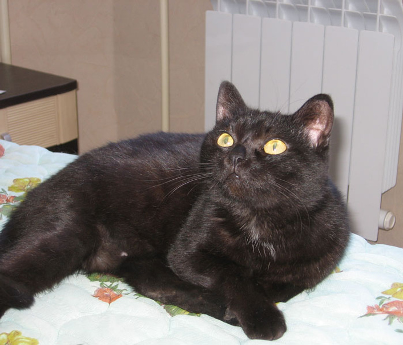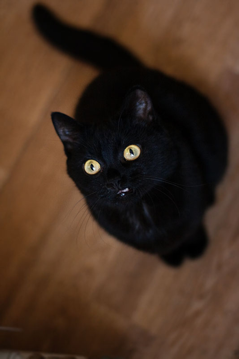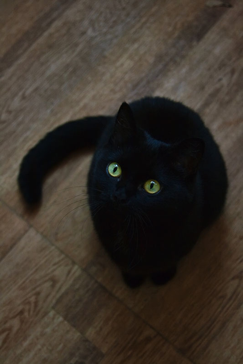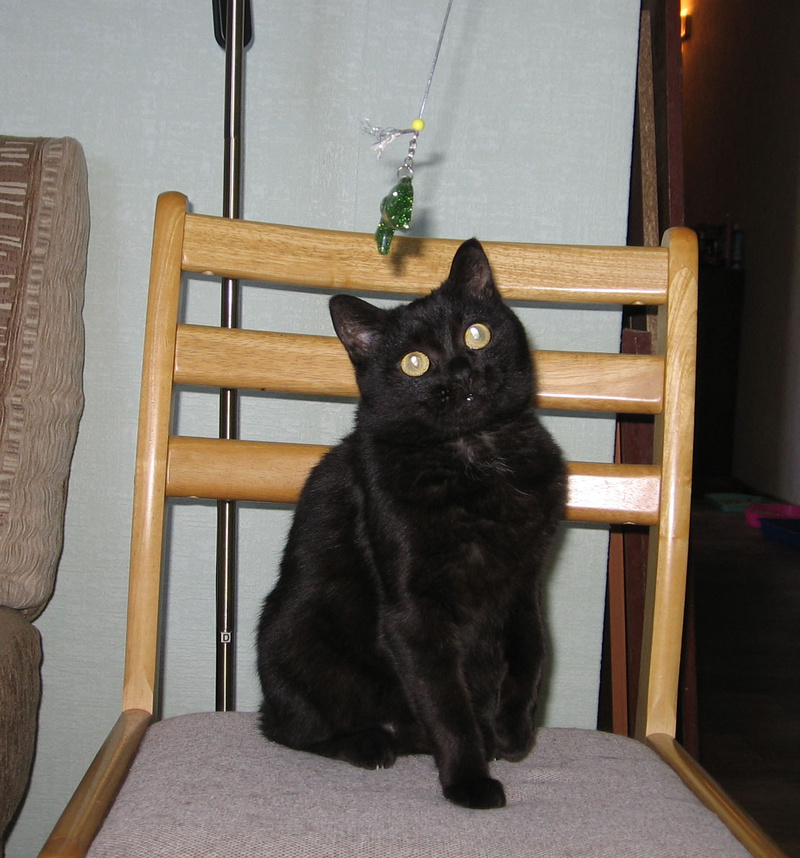 Чёрная бархатная шёрстка, круглая головка ( не иначе, в родне пробегали британцы) и очень выразительные медовые глаза. Какая-то мультяшная у неё внешность.