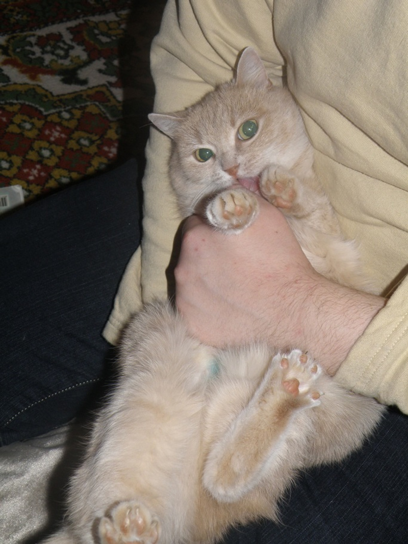 Девочка очень общительная -любит руки, любит «обниматься», когда берешь на руки, утыкается носом в шею и урчит. Игрива, как котенок: с упоением носиться за своим хвостом и различными игрушками. Стерилизована, приучена к лоточку.