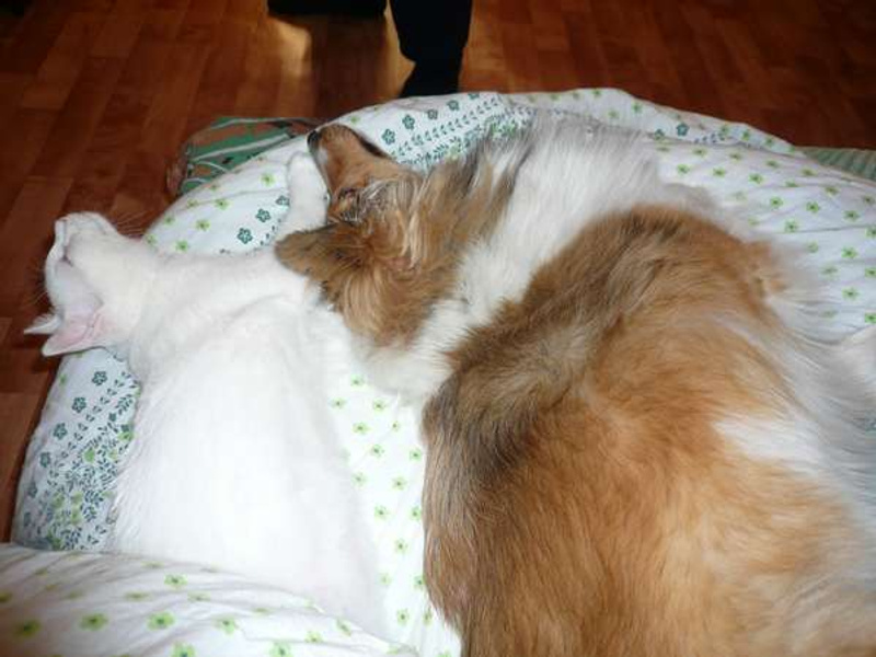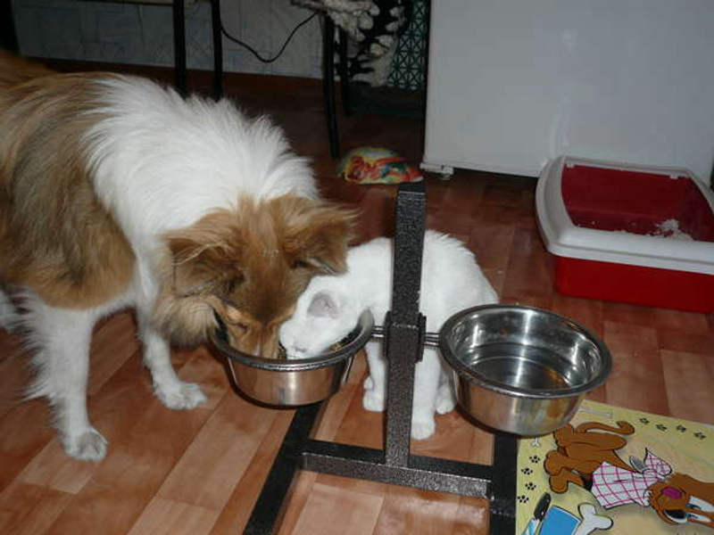 Ладит с некрупными собаками (с моей шелти живут душа в душу). На крупных не проверяли.