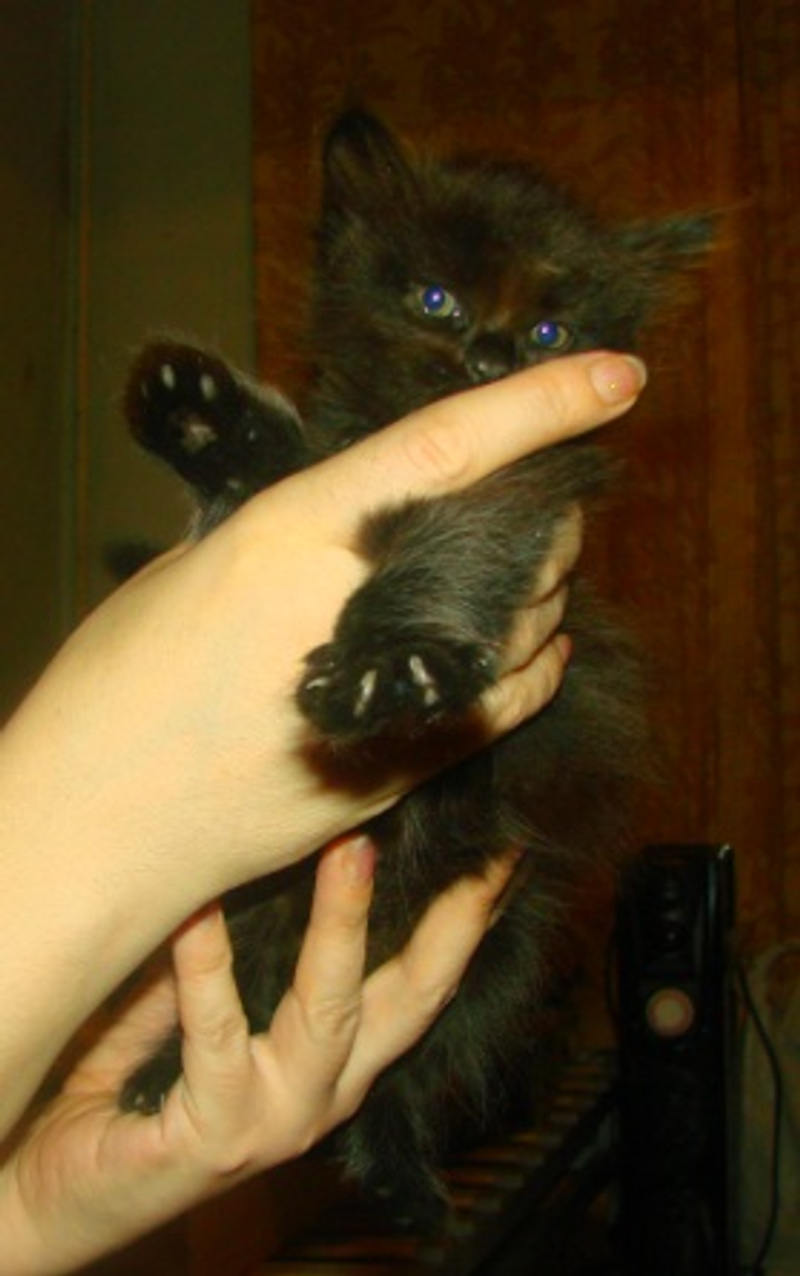 Родился 3.02.2011г. Нет такой породы - метис. Котенок - домус Окрас темный, но при разном освещении переливается оттенками от рыжего до серебра. Кушает все.