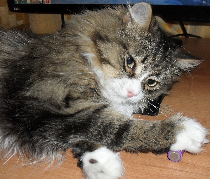 Котик милый, любит поиграть, побегать за мячиками, заиграть какие-нить нужные штучки, которые потом можно весело выковыривать из труднодоступных мест)))) когда Кузя игрался со мной - он ни разу не выпустил коготочки и не укусил меня, чтоб мне стало больно. Он деликатный мальчик. Его можно тискать, ласкать, гладить, чесать за ушком - ему все нравится и он очень терпеливый.