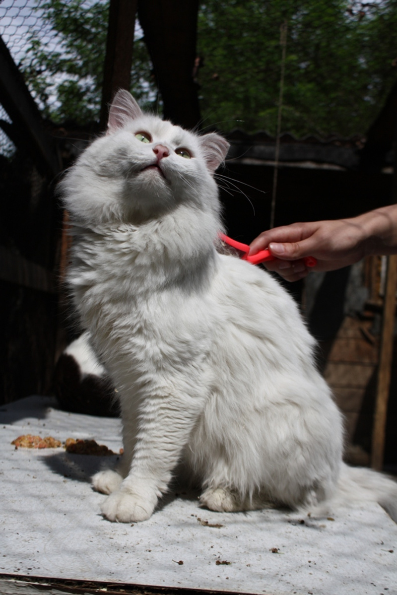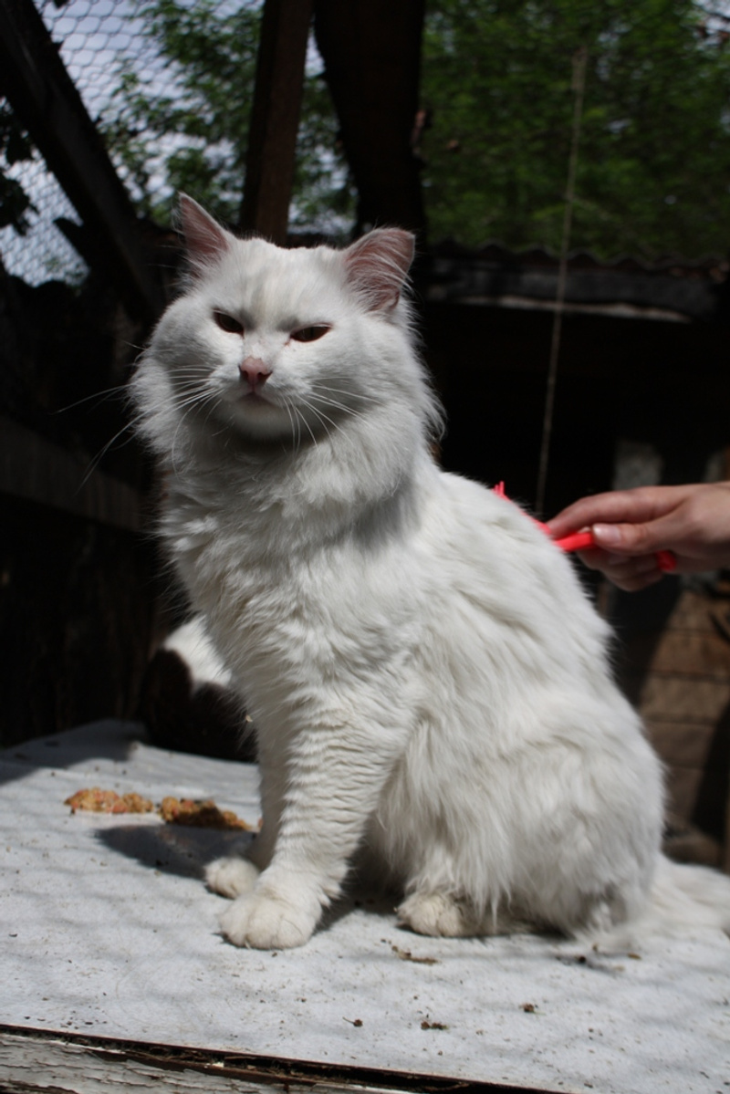 Такой ласковый, немного флегматичный котяра. Кастрирован. На фотографиях он немного серый, но это освещение и грязь. Мыть его в приюте нереально